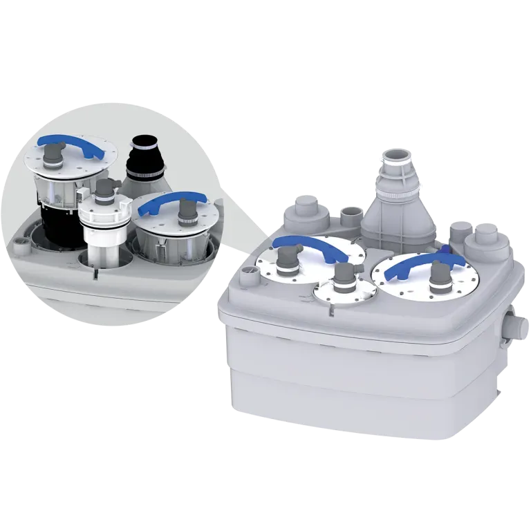 Esta estación de bombeo dispone de 5 entradas multi-diámetro: 2 entradas en los laterales y otras 3 en la parte superior del aparato. Se pueden conectar tubos de diámetro 40 mm, 50 mm, 100 mm o 110 mm. SANICUBIC 2 Pro WP está diseñado para resistir aguas de hasta 70º junto a un uso intensivo.