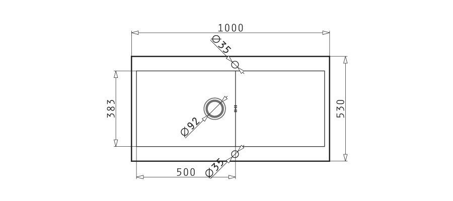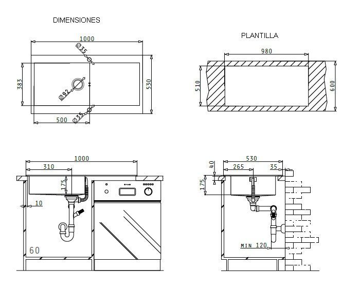 1 Seno + 1 Escurridera. Acero inoxidable cepillado. Espesor de la chapa 1 mm. 1 Orificio para grifería. Medidas del Fregadero: 1000 x 530mm. Incluye Válvula Automática con Rebosadero _92 y Sifón salva espacio de 1 Vías. Embalaje en caja de cartón.